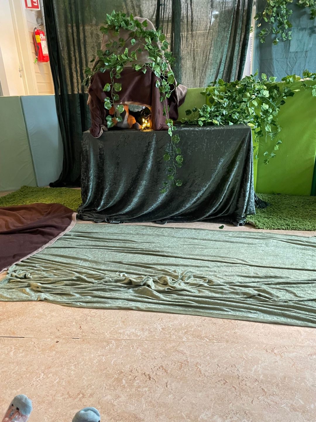 Bruk av teater og konkreter er en viktig del av vår formidling til barna i barnehagen. Her er scena rigget for Gruffalo teater av de voksne på Marihøna for alle barna i barnehagen.