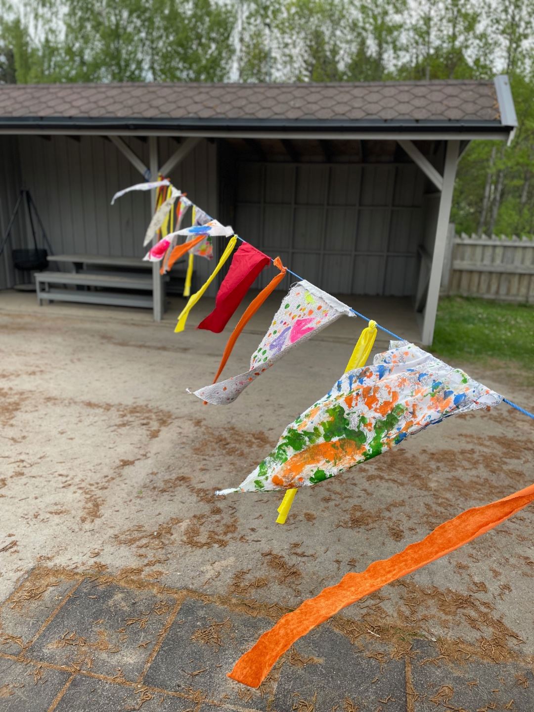 Å delta med prosjekter til Stoppested verden gir oss en god mulighet til å trekke inn Rammeplanen for barnehagen og området kunst, kultur og kreativitet. Her har vi lagt vekt på fantasi, kreativ tenking og skaperglede. Gjenbruk av ulike typer tekstiler har blitt til en fin vimpel på 30 meter, og barna har malt og brukt ulike teknikker for å dekorere vimplene.